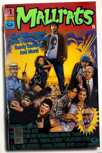 One day I go in with him to pick out movies and I see this colorful comic book-ish poster on display. It’s for a flick out soon on video. And I’m just in awe. The thing actually resembles a comic book cover. But what really captures my attention is the illustration on the poster’s bottom right corner. It reads “In this issue… STAN LEE.” And let me tell you, I was going through a Stan Lee phase. And here he was, in a movie!!!